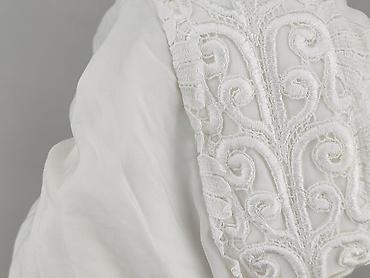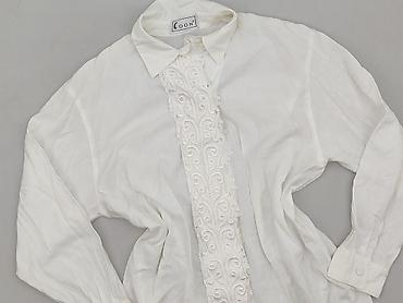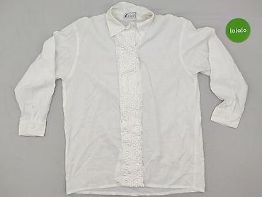 Biała damska koszula z długim rękawem, rozmiar L. Opis: - klasyczny kołnierzyk z dekoracyjnymi, ażurowymi wstawkami przy nasadzie - pionowe zakładki/plisowania z przodu, optycznie wysmuklające syl...