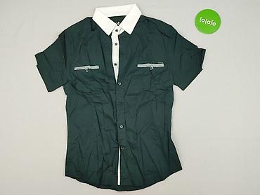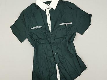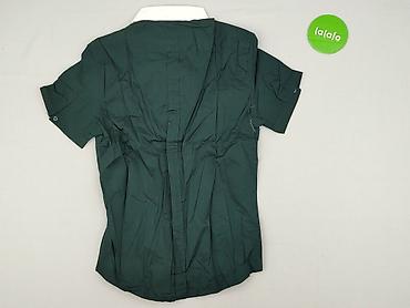 Koszula damska z krótkim rękawem, zapinana na guziki. - Kolor: ciemna zieleń z jasnozielonym, abstrakcyjnym wzorem (geometryczne linie i kwadraty) - Kołnierzyk klasyczny - Materiał lekki, cienki...