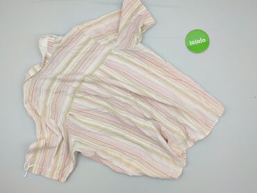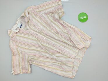 Koszula damska w paski, krótki rękaw - Krój: koszulowy, zapinana na guziki z przodu - Kołnierzyk klasyczny - Wzór: pionowe i skośne paski w odcieniach niebieskiego, bieli i jasnego beżu – optyczni...