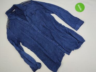 Długa koszula/ tunika jeansowa damska - Materiał: lekki, miękki denim (bawełna) - Kolor: klasyczny niebieski jeans - Krój: wydłużony, za biodra; zaokrąglony dół - Zapięcie: pełny rząd drewnianych/...