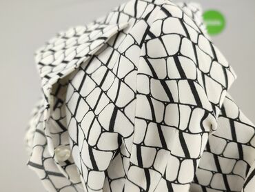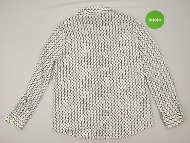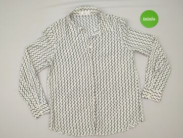 Koszula damska z długim rękawem - Kolor: biel z beżowym, powtarzalnym nadrukiem (litera „L”, kwiatki, korony, geometryczne motywy) - Krój: klasyczny, zapinana na guziki z przodu, kołnierzyk, manki...