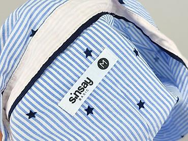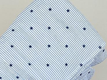 - Wzór: drobne granatowe gwiazdki na niebiesko-białej pionowej prążkowanej tkaninie