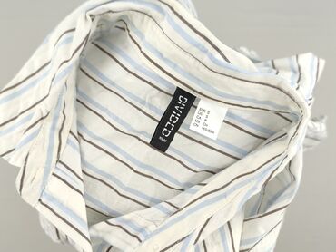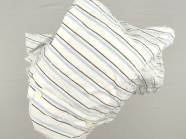 Koszula damska z krótkim rękawem - Krój: klasyczny, taliowany, z kołnierzykiem i zapięciem na guziki z przodu - Wzór: pionowe pasy w odcieniach bieli i jasnego błękitu (różna szerokość pasów, deli...