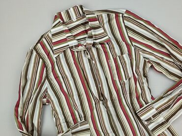 Damska koszula w paski, rozmiar XL - Fason: klasyczna koszula zapinana na guziki, kołnierzyk, długi rękaw z mankietami na guziki - Wzór: wielokolorowe pasy (brąz, oliwkowy, róż/amarant, biel, jasn...Stan: