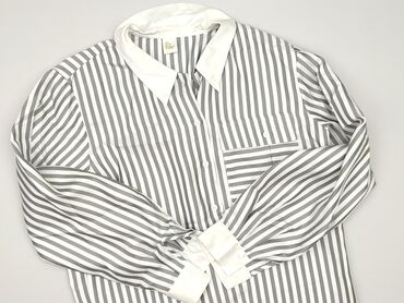 Koszula damska w paski - Fason: dopasowana koszula z kołnierzykiem i długim rękawem - Zapięcie: na guziki z przodu - Wzór: wąskie, pionowe paski w odcieniach szarości i bieli - Materiał: lekka, gł...Stan: