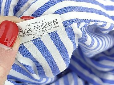 Koszula damska w paski - Krój: luźny, z opuszczoną linią ramion; tył nieco dłuższy niż przód (zaokrąglony dół) - Wzór: wąskie, pionowe paski w kolorze niebieskim i białym - Zapięcie: półplisa na g...