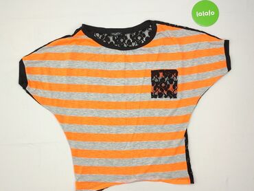 Bluzka damska Szachownica, rozmiar S. - Fason: luźna, z krótkim rękawkiem typu kimono - Dekolt: w serek (V-neck) z delikatną lamówką - Wzór: marynarskie paski w odcieniach granatu, czerni i bieli ...