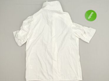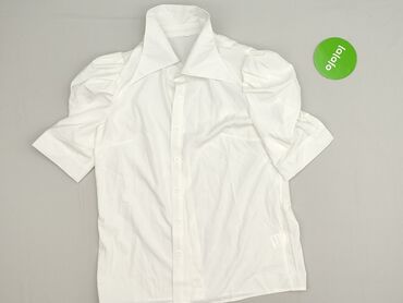Biała koszula damska z krótkim rękawem, r. M - Fason: prosta, lekko luźna, z rozcięciami po bokach u dołu - Zapięcie: na guziki z przodu - Kołnierz: szeroki, spiczasty - Rękaw: krótki - Detale: dw...
