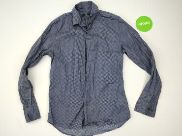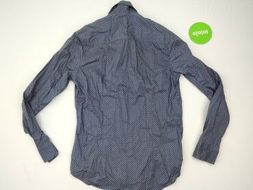 Męska koszula z długim rękawem, rozmiar L. - Kolor: granatowy z drobnym, geometrycznym wzorem (rombiki). - Fason: klasyczny kołnierzyk, zapięcie na guziki z przodu, mankiety zapinane na dwa guzik...