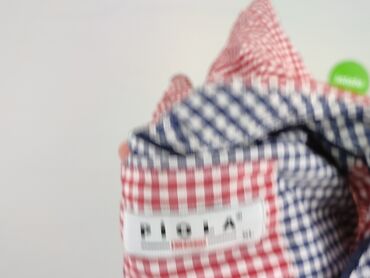 - Wzór: drobna kratka czerwono-biała; kontrastowe elementy w granatowo-białą kratkę przy listwie guzikowej i wewnątrz kołnierza