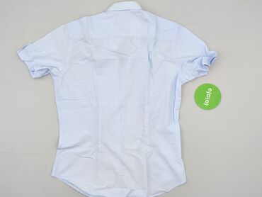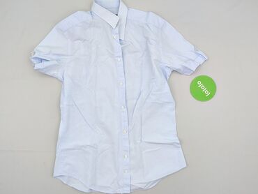 Koszula męska EX MEN’S SHIRTS z krótkim rękawem. - Kolor: błękitny z kontrastowym, białym kołnierzykiem. - Krój: klasyczny, z zaokrąglonym dołem i pojedynczą kieszonką na piersi. - Zapięcie: na gu...