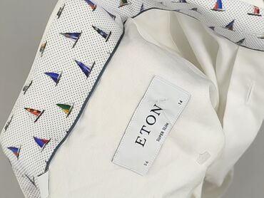 Męska koszula z krótkim rękawem marki Eton, wykonana z lekkiego, beżowego materiału. Charakteryzuje się klasycznym kołnierzykiem i zapięciem na guziki na całej długości. Na piersi znajduje się prak...