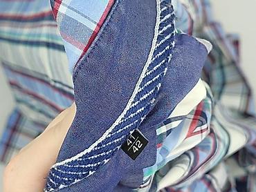 - Wzór: krata w odcieniach błękitu, granatu, bieli z akcentami czerwieni i zieleni