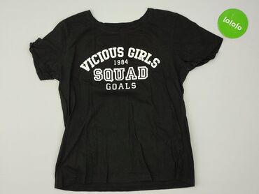 Czarna damska koszulka Sinsay, rozmiar S. - Krótki rękaw, okrągły dekolt - Nadruk na przodzie: srebrzysty efekt „splasha” z napisem BRIGHT - Gładki tył - Miękka, cienka dzianina bawełniana (metka ...