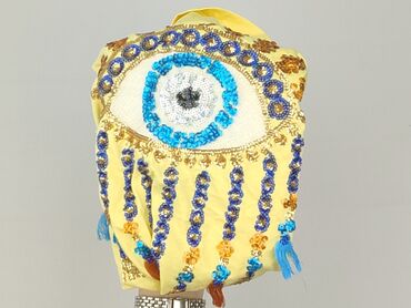 - Dekor: duża aplikacja na przodzie – oko z motywem talizmanu, bogato zdobiona cekinami i koralikami w odcieniach niebieskiego, złota i srebra, z dekoracyjnymi frędzlami.