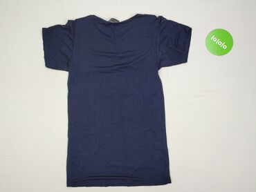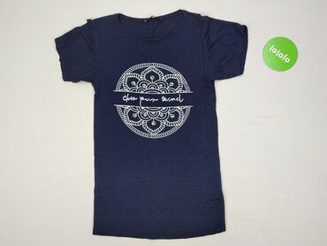 Damska koszulka z krótkim rękawem - Krój: prosty, swobodny, klasyczny okrągły dekolt - Wzór: graficzny print w białe kwadraty, przechodzący w gładki, nakrapiany granat; efekt ombre od jasnego błęk...