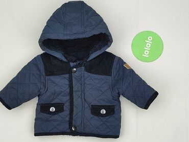 Kurtka niemowlęca z kapturem 0–3 m - Kolor: granatowy z żółtymi i biało‑szarymi akcentami (paski na wykończeniach). - Zapięcie: zamek błyskawiczny z przodu + dodatkowy zatrzask przy kapturze. - Ki...
