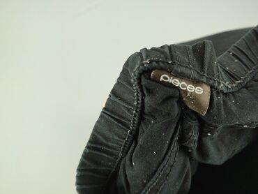 Czarne spodnie damskie z ozdobnym pasem i guzikami - Krój: luźniejsze nogawki zwężane ku dołowi, lekko marszczone przy biodrach - Pas: szeroka, elastyczna gumka dla wygody; z przodu dekoracyjna li...