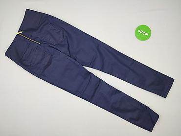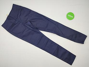 - Krój: dopasowany, nogawki zwężane; wysoki stan z szerokim pasem