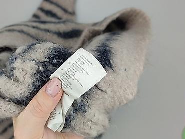 - Materiał (wg metki): 61% poliester z recyklingu, 19% akryl, 19% poliamid, 1% włókno metaliczne – miękki, „puszysty” splot z delikatnym połyskiem