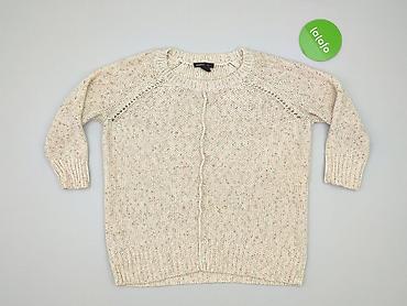 Uniwersalny, ciepły sweter idealny do jeansów i spódnic, w subtelnym, neutralnym kolorze urozmaiconym kroplami koloru. Model dla kobiet. Używany.