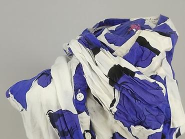- Kolor i wzór: białe tło w duże, efektowne kwiaty w odcieniach kobaltu/fioletu z czernią i różem