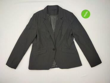 Żakiet damski F&F - Kolor: ciemnoszary w drobny prążek - Krój: klasyczny, taliowany; klapy w szpic (notch lapel) - Zapięcie: 2 guziki z przodu; na mankietach ozdobne guziki - Kieszenie: dwie przed...