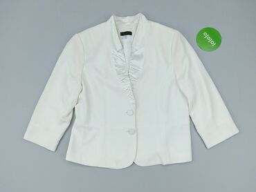 Biały damski żakiet bez zapięcia - Krój: krótki, lekko taliowany, z pionowymi przeszyciami modelującymi sylwetkę - Rękawy: długie - Dekolt: otwarty, bez kołnierza - Zapięcie: brak – luźno układają...