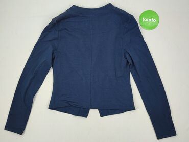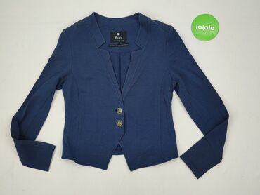 Marynarka damska w paski H&M - Model: krótka marynarka bez zapięcia, z kontrastową granatową lamówką przy krawędziach - Wzór: poziome granatowo-białe paski, styl marynistyczny - Fason: lekko talio...Stan: