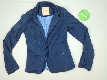 Granatowa marynarka damska - Klasyczny, taliowany fason z klapami - Zapinana na jeden guzik (kontrastowy, jasny) - Długi rękaw; możliwość podwinięcia mankietów z delikatną, prążkowaną wstawką wewn...Stan: