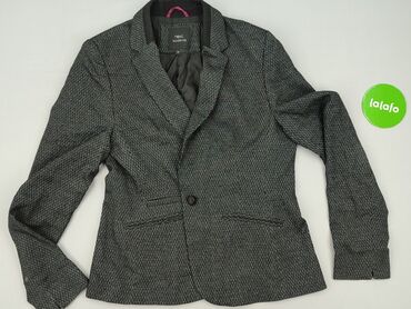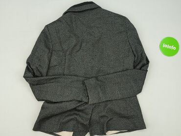 Szary żakiet/marynarka damska, rozmiar L. - Klasyczny krój z klapami w szpic - Zapinanie z przodu na 2 guziki - Dwie kieszenie z przodu typu listewka - Długi rękaw, przy mankietach po 3 dekoracyjn...
