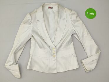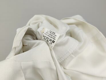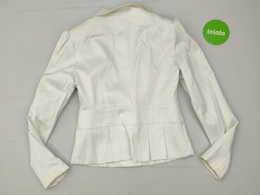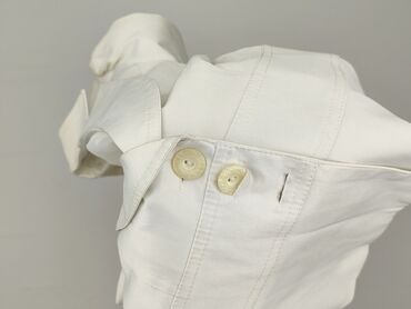 Biała damska marynarka/żakiet z półkrótkim rękawem - Fason: dopasowany z modelującymi przeszyciami, lekko rozszerzany dołem - Zapięcie: 3 guziki z przodu - Kołnierz: wysoki/stójka, nowoczesna lini...