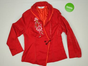 Żakiet damski bez zapięcia – kolor intensywnej czerwieni. - Krój: taliowany, podkreślający sylwetkę; przód bez kołnierza i bez guzików, lekko otwarty. - Rękawy: długie. - Podszewka: jasnoróżowa we...Stan: