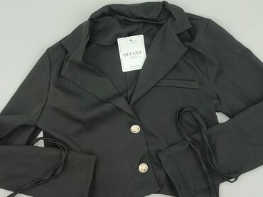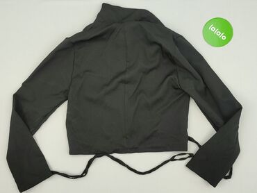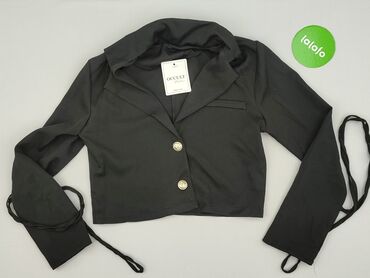 Czarna krótka marynarka damska - Fason: krótki żakiet, prosta linia - Zapięcie: na 4 guziki z przodu - Kołnierz: stójka - Rękawy: długie - Materiał: gładka tkanina garniturowa (syntetyk/bawełna – ...