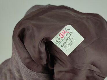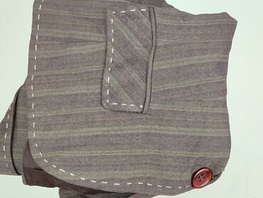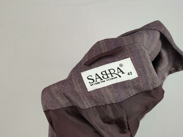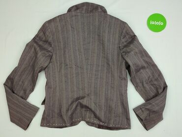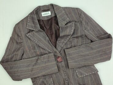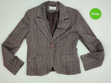 Damska marynarka Geber - Kolor: ciemny brąz z delikatnym, pionowym prążkiem - Krój: krótka, taliowana, z klapami; długie rękawy - Zapięcie: trzy guziki z przodu (środkowy ozdobny w złotym kolorze)...