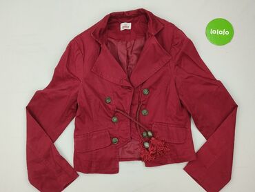 Żakiet damski Sharon Line, rozmiar 38 - Krój: krótki, dopasowany, z kołnierzem koszulowym - Kolor: głęboki bordo/wiśnia, kontrastowe, pomarańczowe przeszycia - Zapięcie: rząd jasnych guzików z prz...