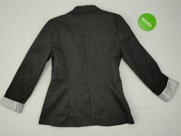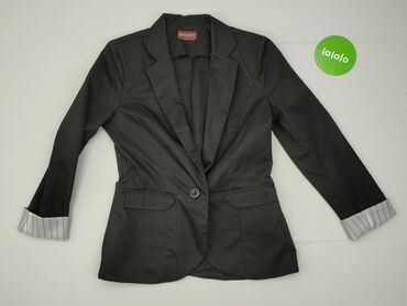 Damski czarny blazer w rozmiarze 36, zapinany na trzy guziki, z rękawami 3/4. Posiada klapy i taliowany krój. Idealny do noszenia na co dzień, zarówno do biura, jak i na wieczorne wyjścia. Materiał...