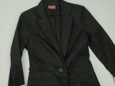 Damska marynarka czarna, rozmiar 38 - Fason: taliowana, jednorzędowa na 2 guziki - Kołnierz: klasyczne, szerokie klapy - Rękawy: długie - Kieszenie: dwie z przodu z patkami (dekoracyjne) - Tył: mo...