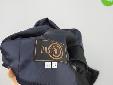 Czarna marynarka damska DASTAN, rozmiar 46 (wzrost 176). Klasyczny, jednorzędowy krój z klapami i pojedynczym zapięciem na guzik. Z przodu kieszeń piersiowa oraz dwie kieszenie z patkami. Rękawy z mankietami zapinanymi na guziki, wewnątrz dekoracyjna, połyskująca listwa. Podszewka w kolorze granatowym.