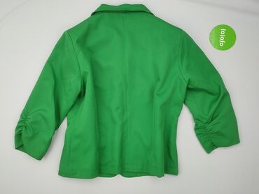 Marynarka damska w kolorze butelkowej zieleni. - Krój: lekko taliowany, bez zapięcia (otwarta klapa), rozcięcie z tyłu. - Rękawy: długość 3/4 z dekoracyjnym marszczeniem. - Materiał: tkanina o gęs...