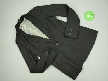 Czarny damski żakiet - Krój: klasyczny, lekko taliowany, z kołnierzem z klapami - Zapięcie: 2 guziki z przodu - Kieszenie: dwie naszywane z przodu z delikatnym marszczeniem - Rękawy: długie - Mate...