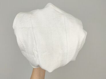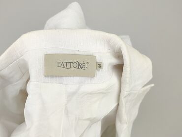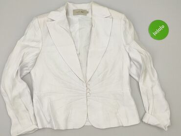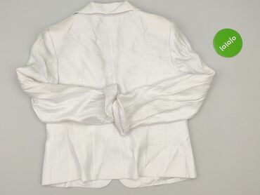 Biała damska marynarka/żakiet z półkrótkim rękawem - Fason: dopasowany z modelującymi przeszyciami, lekko rozszerzany dołem - Zapięcie: 3 guziki z przodu - Kołnierz: wysoki/stójka, nowoczesna lini...