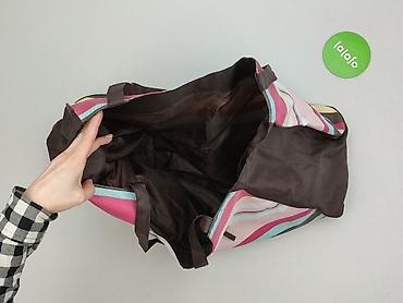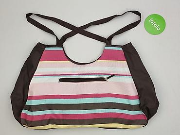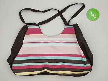 - Wzór: wielokolorowe poziome pasy (róż, turkus, żółty, brąz, biel) + gładkie brązowe boki