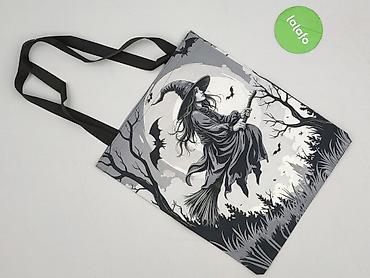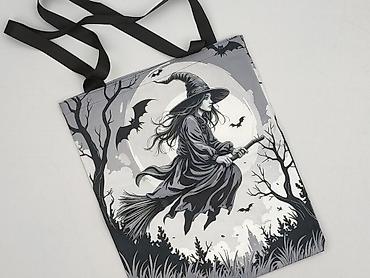 Torba na ramię z nadrukiem „Wiedźma na miotle” – czarno‑szara - Typ: lekka torba shopper na długich taśmach do noszenia na ramieniu - Design: grafika z wiedźmą lecącą na tle księżyca, nietoperze, ...Typ:
