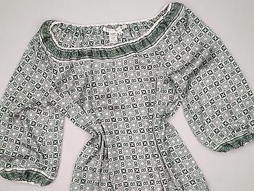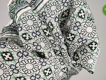 - Wzór: geometryczno‑kwiatowy, mozaikowy; kolory biel, zieleń, czerń z akcentami niebieskiego; dekoracyjna lamówka przy dekolcie i mankietach