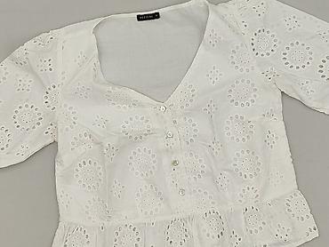 Biała bluzka damska z lekkiej, przewiewnej tkaniny - Rozmiar: S (metka) - Materiał: 100% bawełna - Fason: luźniejszy, tunikowy - Rękaw: 3/4 zakończony mankietem - Dekolt: w kształcie litery V z lis...