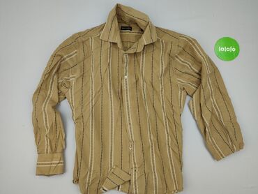 Koszula męska Gatsby, krótki rękaw - Klasyczny fason, zapinana na guziki - Wzór: drobne, pionowe prążki w odcieniach beżu/kawy - Kontrastowe, brązowe wykończenia: wewnętrzny kołnierz, listwa guzik...Stan: