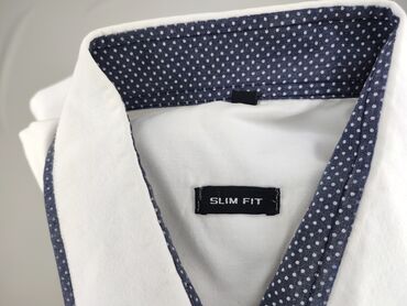 Koszula męska Boston Public Slim Fit - Krój: slim fit - Rozmiar z metki: 37/38 - Kolor: biały z granatowymi, drobno kropkowanymi wstawkami przy listwie guzikowej oraz lamówką przy kołnierzyku i ma...