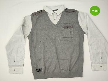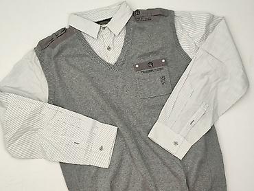 - Kolor: koszula biała w cienkie szare prążki; sweter szary melanż