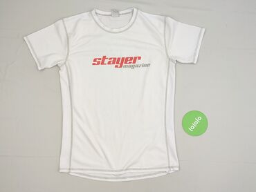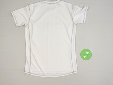 Biała koszulka sportowa z krótkim rękawem - Krój: klasyczny T-shirt, okrągły dekolt - Kolor: biały z nadrukiem na przodzie – dwa poziome pasy z gęstymi, cienkimi czarnymi kreskami oraz jeden grubs...